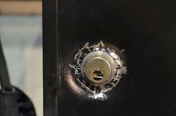 Сначала была осуществлён взлом с применением электроинструмента. Используя кольцо в качестве направляющей для круговой фрезы, в наружном листе двери и шасси профрезеровали отверстие, достаточное, чтобы извлечь броненакладку с кольцом. После этого высверлили с применением твердосплавных и HSS свёрл винты крепления броненакладки, извлекли её, и переломили цилиндр.