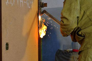 После неудачной попытки сверления испытатели решили резать ацетилен-кислородным резаком петлевую часть полотна, вдоль противовзломного лабиринта. Совершенно бесперспективный для дверей первого и второго класса, в данном случае, по мнению испытателей, он мог оказаться менее затратным. После перерезания полотна его отжали рычажным инструментом. Значение сопротивления составило 135 Ес.